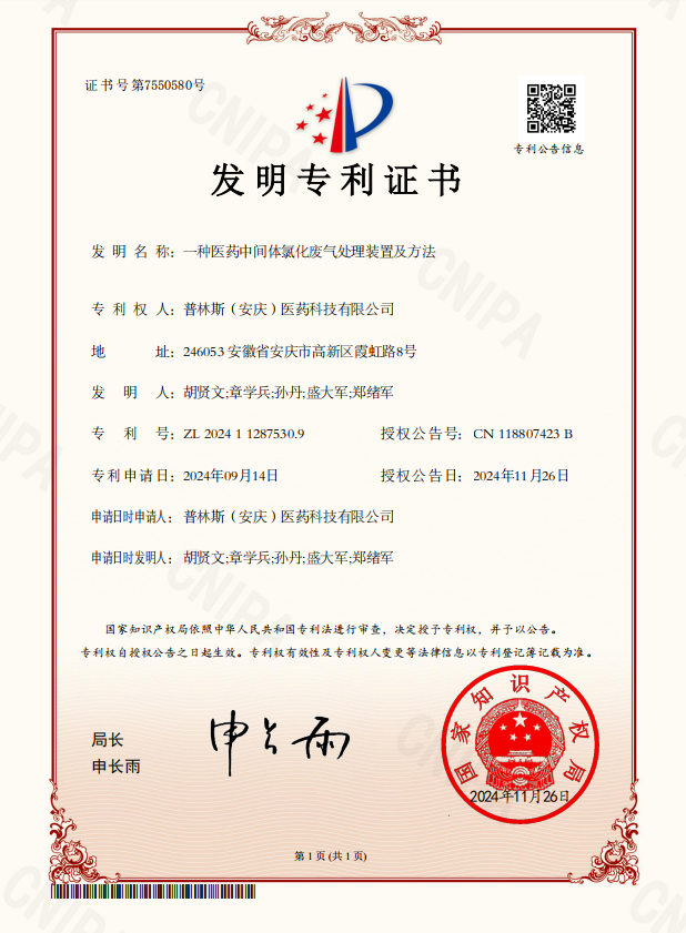 11月26日,由普林斯(安庆)申报的“一种医药中间体氯化废气处理装置及方法”喜获国家知识产权局授权。